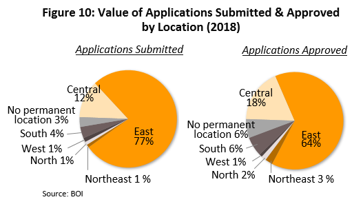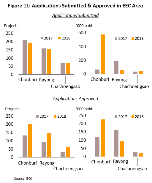 In 2018, there were 1,626 applications for BOI incentives. Although this represents only 3.1% growth, the total value of applications jumped by 43% to THB900bn. The bulk of these (77%) were for projects in the eastern region, which total value increased at an even faster rate of 134% to THB690bn (Figure 10). This suggests the eastern region still appeals to investors and there is still growth potential. There is especially strong interest in the EEC, where the number of applications had dropped by 3.2% to 422 projects but investment value has surged by 137.4% to THB680b. Within this area, Chonburi received the most applications and highest investment value (Figure 11).