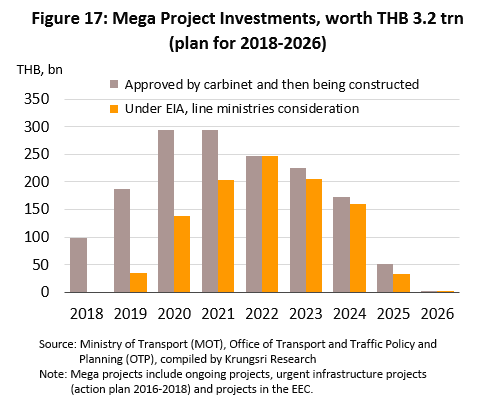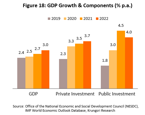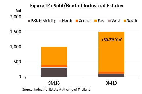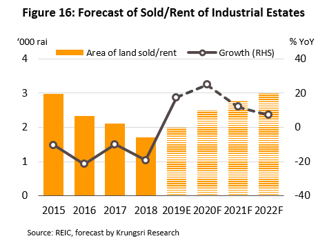 Krungsri Research forecasts that between 2020 and 2022, the industrial estate sector will see strong growth and land sale and leases will rise by an average of 10-15% p.a. to 2,500-3,000 rai (Figure 16). This outlook is supported by the following factors.