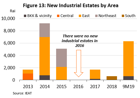 In September 2019, there were 59 industrial estates in Thailand, spread across 16 provinces (Figure 2). Of this, 14 were operated by the IEAT and the remaining 45 were joint-ventures with the private sector. The eastern region housed the vast majority (76%) of these (Figure 3), followed by the central area (including Bangkok Metropolitan Region) with 16%. Between 2013 and 2018, total industrial estate land – including new estates and expansion of existing estates – increased by only 3.3% (Figure 4). The slower supply growth was due to operators waiting for more clarity on new investment policies at that time.