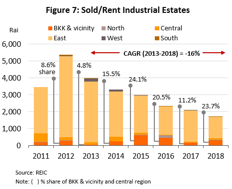 Bangkok and Central region: This region benefits from its location, as the center of manufacturing and national transport and communication networks. The central region includes Bangkok which is home to the most expensive industrial land in the area, and provinces with important industrial estates, including Samut Prakan, Ayutthaya, Saraburi, Ratchaburi and Samut Sakhon. Previously, auto parts, electrical appliances and electronics manufacturers had been concentrated in the area, along with industries that utilized local resources, such as food processing and construction materials. The region is still home to a large number of SME factories. However, industrial estates in the region had been badly affected by severe flooding in 2011 and demand (rent and sale) for industrial space in the region reached only 8.6% and 4.8% of the national total in 2012 and 2013, respectively. The situation has improved since, and between 2014 and 2018, they reached double-digit. This illustrates the continued ability of industrial estates in the Bangkok Metropolitan Region and wider central zone to attract investors (Figure 7).