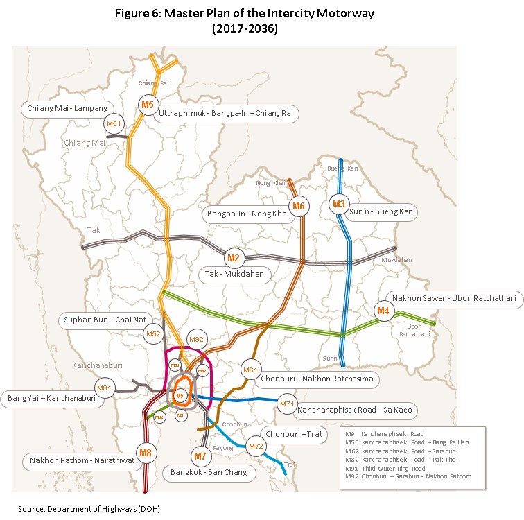 - The northern and northeastern regions: Generally, industrial estates in these areas host food processing industries together with some electronics manufacturers, but transportation links are inferior to those in other parts of the country and this has tended to curb interest from investors. However, progress on developing roads (Figure 6) and rail links in the north and northeast that will connect Thailand to its neighbors (Northern line: dual-track railway Denchai-Chiang Rai-Chiang Khong; Northeastern line: dual-track railway Bann Phai-Nakhon Phanom) and then on to China and Vietnam should help to stimulate future investment. At present, industrial estates are located in the northeastern province of Udon Thani and in the northern provinces of Lamphun and Phichit.
