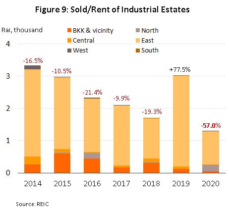 - Demand: Sales and leases of land on industrial estates rose 77.5% from the 2018 level to 3,022 rai (Figure 9). 2,812 rai of this was in the eastern region (93% of all sales and leases), a rise of 124.6% thus underlining the continuing potential of the area to attract greater interest than elsewhere in the country.
