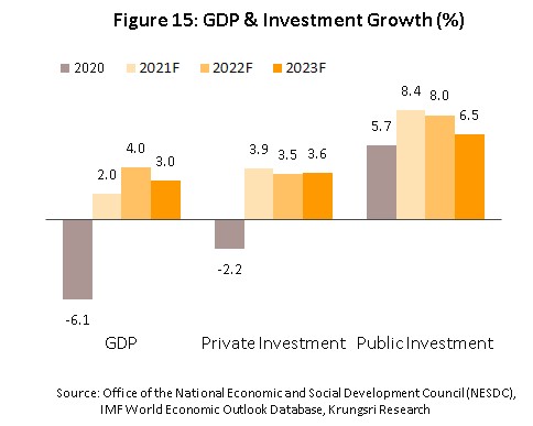 - The outlook will improve for the Thai economy and domestic investment over 2021-2023. Following a 6.1% fall in GDP in 2020, Krungsri Research sees Thailand managing growth of 2.0% in 2021, which will then accelerate to 4.0% in 2022 and 3.0% in 2023. Investment by both the public and private sectors will also strengthen over this time period (Figure 15), helped by the following.