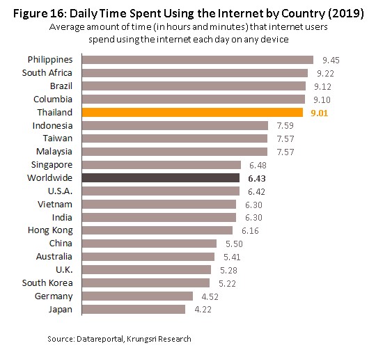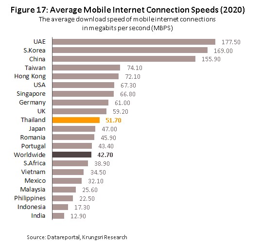 1) Daily consumption of internet services in Thailand rose from an average of 5.5 hours in 2015 to 9.01 hours in 2019 (significantly above the global average of 6.5 hours per day). Average connection speeds for mobile devices also rose from 2.8 Mbps in 2015 to 51.7 Mbps in 2020 (against a global average of 42.7 Mbps) (Figure 16 and Figure 17).