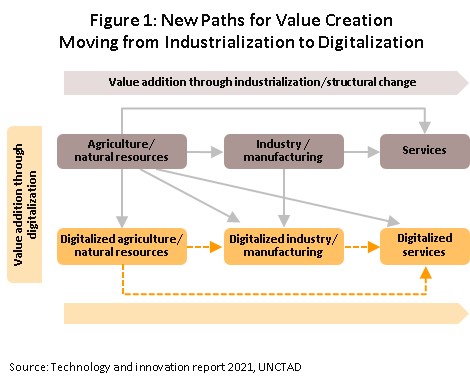 3) Digital content: The ever-rising popularity of online games means that much of the growth in this segment will come from game developers, and as such, mobile cloud gaming will have an increasingly important role to play in this space. However, the likely weak state of the economy in 2022 and 2023 means that growth is expected to be only anemic for animators and character developers.The digital services and software industry encompasses the production of products and the offering of services that are based on digital technology. This includes the development of digital platforms and the use of these to deliver contents and transactions to users, as well as more general software development and the provision of software services. This broad group of digital products and services, taken together with the innovation and creativity that the digital economy engenders, has now become a crucially important part of the value creation process towards digital economy. Indeed, the global industrial transformation that the digital revolution has ushered in is now allowing businesses to develop new sources of value for their customers. For providers of services, digitalization is thus tending to find an increasingly broad range of roles in the value-adding process (UNCTAD 2021, Figure 1).
