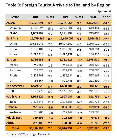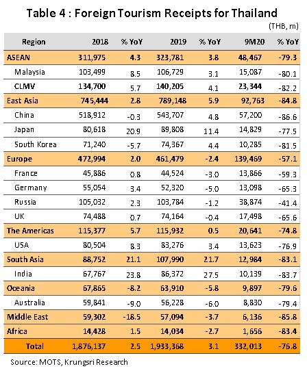 Receipts within the sector has naturally collapsed with the steep drop in arrivals. In 9M20, tourism receipts crashed 76.8% YoY to THB332bn. This drop was seen across the industry, with strong declines recorded from major markets of China (-86.6% YoY), India (-83.7%), South Korea (-81.5%), the United Kingdom (-65.6%) and Russia (-41.4%) (Table 4).