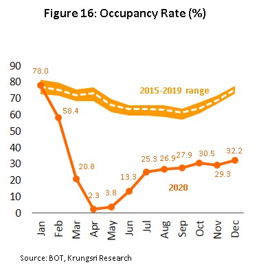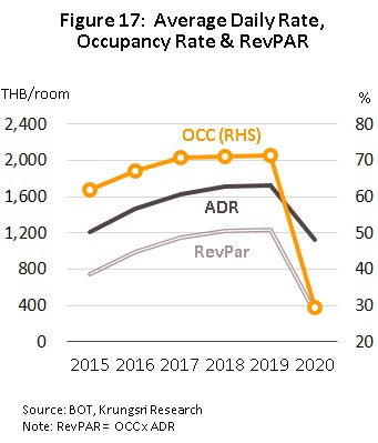 - With these declines in visitor numbers, the national average occupancy rate naturally plummeted. It slid from 71.4% in 2019 to 29.5% in 2020, and touched a historic low of just 2.3% in April (Figure 16). Average room rate also fell 34.9%. These two trends combined had reduced average room rate from THB1,229 in 2019 to only THB331 in 2020 (-73.1%) (Figure 17). This had a direct impact on industry revenues.
