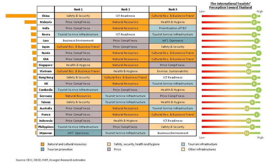 3) Long-term growth potential of the Thai tourism sector: Krungsri Research analyzed the preferences of travelers from 48 countries and concluded that Thailand remains a favored destination for tourists from many countries. Indeed, Thailand was ranked among the top 10 destinations for travelers from almost all countries surveyed (Box 2), with Indian, Russian and Cambodian travelers placing Thailand in 2nd place. Chinese and Malaysian tourists placed Thailand in 8th place. This supports the potential for Thailand’s tourism sector to meet consumer demand in the post- COVID world.