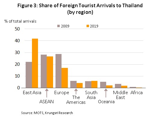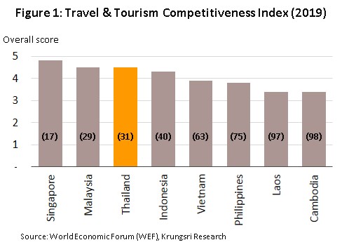 the country benefits from competitive pricing for accommodation and low cost of living, which offers better value-for-money than many other countries. Beyond this, the travel industry benefits from the country’s extensive, comprehensive transportation network, national infrastructure that is constantly being upgraded, and the increasing number of low-cost carriers serving the local market. These factors helped to give Thailand an edge over its competitors. Indeed, the 2019 Travel and Tourism Competitiveness Index, compiled by the World Economic Forum places Thailand in 31st place out of 140 countries surveyed (up from 34th in 2017) and 3rd in Southeast Asia, after only Singapore and Malaysia (Figure 1).