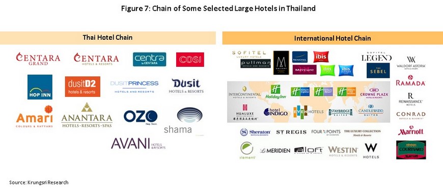 Looking at the supply side, the growth of the tourism sector has continued to feed into more hotels and room supply. Foreign tourists tend to be concentrated in Bangkok, which is both a center for tourism in its own right and the national travel hub, and the world-famous seaside resorts of Phuket and Pattaya (in Chonburi province). But in recent years, the official policy has been to develop tourism across the country (for example, in secondary tourist centers) and to improve the standards of regional airports and the national transportation networks. This has pulled in private-sector investment in hotels in regional centers and tourist areas such as Chiang Mai, Krabi and Koh Samui (in Suratthani province). The net effect of this is an increase national supply of hotel rooms from 540,088 in 2013 to 784,118 in 2019, or average annual growth of 6.5% (Figure 6) driven by both Thai and international hotel chains (Figure 7).