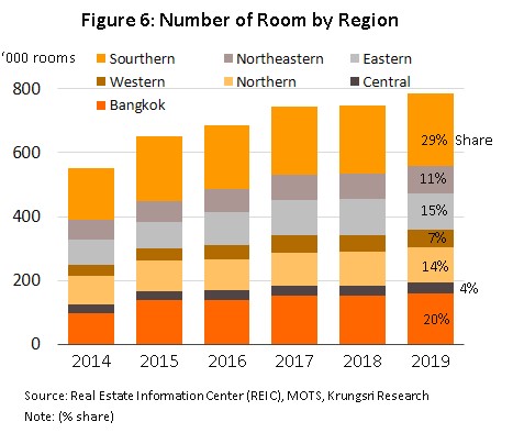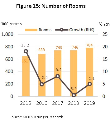 At the end of 2019 (latest available data), the national market had 784,000 hotel rooms, up 5.1% from 2018 (Figure 15). Supply was strongest in the South, which with 226,000 rooms (up 6.7%) was home to 29% of all hotel rooms in Thailand. Another 20% of hotel rooms were in Bangkok with 160,000 rooms (up 4.6%).