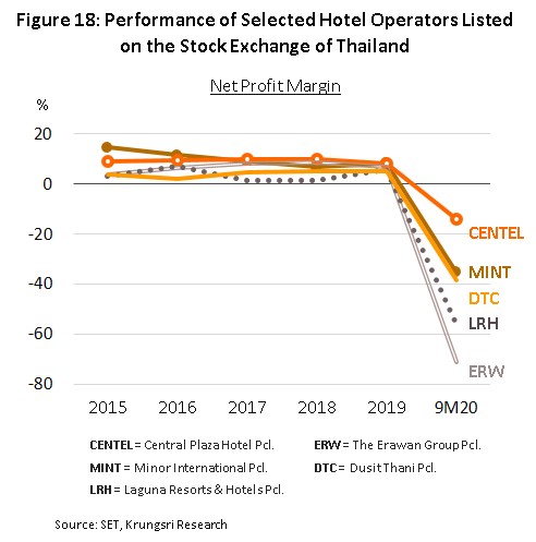 Given the above, the operating performance of major hoteliers worsened dramatically in 2020. For the five hoteliers listed on the stock exchange (Figure 18), overall net profit grew 6.9% in 2019, but contracted by 42.9% YoY in 9M20, though the decline varied with the degree of diversification. Some operators were able to generate more revenues from alternative sources (e.g., food services, distribution of fashion goods), which helped Central Plaza Hotel (CENTEL) and Minor International (MINT) to weather the worst disruption last year.
