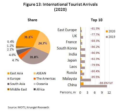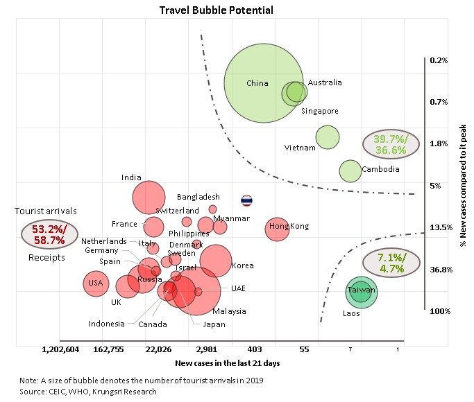Krungsri Research believes Thailand would enter into travel bubble agreements this year (2021). Initially, these would likely to be limited to designated geographical areas where arrivals can be easily screened, such as Phuket and Suratthani (for Koh Samui), and where the local economies are heavily reliant on foreign arrivals. Although the travel bubbles are unlikely to prompt a huge increase in arrivals initially, they would at least prepare the sector to return to growth in the future.