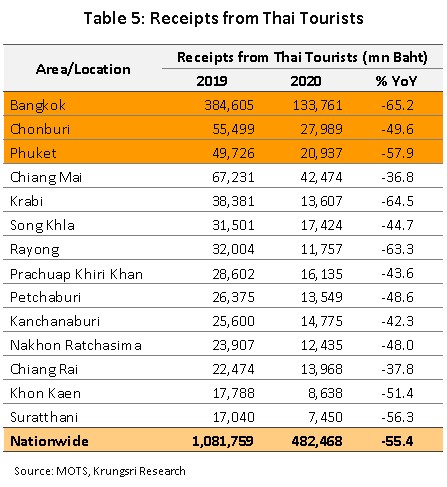 For full-year 2020, revenue from domestic tourism slumped 55.4% to THB482bn (Table 5). The 3 major tourist attractions – Bangkok, Chonburi and Phuket – accounted for 38% (THB160bn) of domestic tourism revenue in 2020.