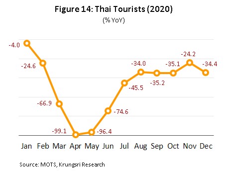 - At the same time, Thais made 90.5 million domestic trips (-47.6% YoY). During April and May last year, domestic tourism almost came to a halt because of the national lockdown. The economy slipped into a sharp recession, unemployment rose, and spending power flatlined. Domestic tourism started to return to life in June, and between then and December, total domestic trips fell by an average of 41.4% (Figure 14), aided by easing lockdown measures and continuous efforts by the government to breathe life back into the sector, notably through the ‘We Travel Together’ program which will run from 1 July 2020 to 30 April 2021.