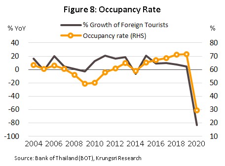 Following weak operations in 2020, hoteliers will continue to see depressed conditions through 2021. The first shoots of recovery will start to break through from the end of this year and throughout 2022 and 2023, but it could take at least 4 years for foreign tourist arrivals to return to pre-COVID level. Against this backdrop, domestic tourism will recover faster, partly thanks to ongoing policy efforts by the government to stimulate demand. By the latter half of 2021, the worldwide rollout of vaccination programs will start to translate into an uptick in foreign tourist arrivals, helped by a recovering global economy and long-term growth potential in the Thai tourism industry. However, in the post-pandemic environment, players in the tourism and hotel industries will need to move rapidly to overhaul their operations onto a more sustainable footing by accelerating the adoption of modern technology, placing greater emphasis on public health and hygiene, and developing their understanding of varied and diverse consumer needs and using this knowledge to offer customized travel experiences.