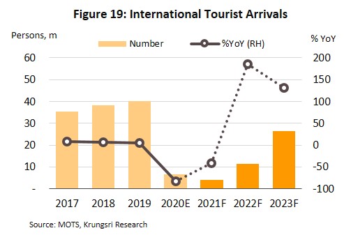 - Foreign tourists: Arrivals should increase steadily with the expansion of the STV scheme and Thailand possibly signing quarantine-free travel bubble programs with several countries (Box 1). By the second half of 2021, the accelerating vaccination programs worldwide will also help to boost foreign arrivals. Krungsri Research forecasts only 4.0 million foreign tourists arriving in Thailand in 2021, but this will rise to 11.4 million in 2022 and to 26.4 million in 2023 (compared to 40 million in 2019) (Figure 19). This is supported by the following factors: