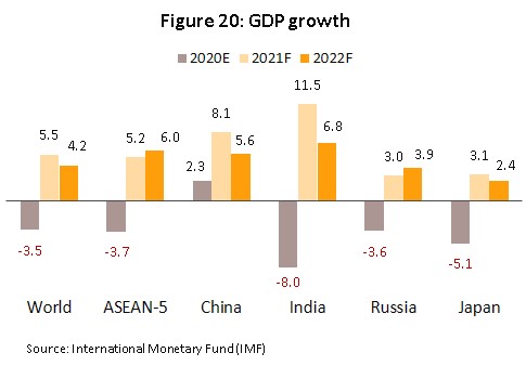 1) Recovering global economy: The International Monetary Fund (IMF) projects global GDP would grow by 5.5% in 2021 and by 4.2% in 2022 (Figure 20). In the case of Thailand, the IMF projects strong growth in Thailand’s main tourist markets of China (+8.1% in 2021 and +5.6% in 2022), India (+11.5% and +6.8%), and Russia (+3.0% and +3.9%).