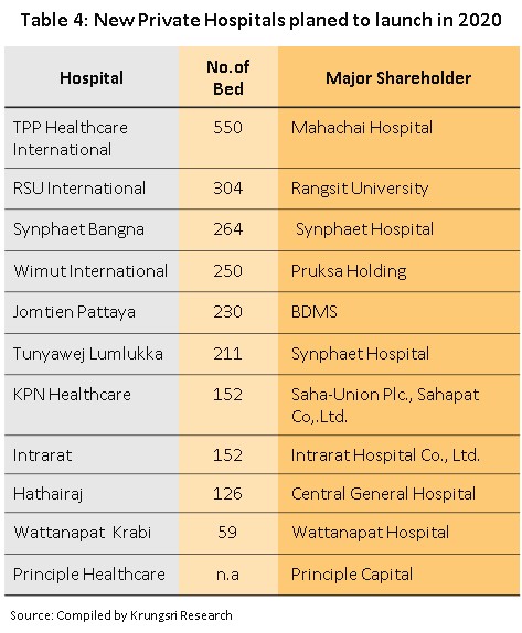 - Operators also have the prospect of stiff competition to look forward to, with this coming from both competitors at home and abroad. In the case of the former, in addition to facing challenges from existing providers of healthcare services that are in the process of speeding up their investments, players will also have to overcome obstacles arising from the entry into the market of businesses from outside the healthcare sector that are attracted by the possibility of securing low risk, secure, long-term returns, though these moves are also in step with shifts in consumer preferences that place greater importance on personal health (Table 4). Foreign investors are also attracted to the sector and this is especially the case for Chinese businesses, which are keen to meet demand from Chinese patients for the treatment of infertility problems in Thai-run clinics. The outcome of these developments has been to create a sharp expansion in the supply of private hospital beds. The total number of these is thus expected to rise by at least 1,000 beds by 2021 from the 2018 total of 40,000 and this will naturally lead to increasing competition between private hospitals, with this likely to occur on both pricing and the range of services offered. In addition to this, competition will also come from government-run hospitals that are developing services that mirror those available in the private sector. Piyamaharajkarun Hospital, part of the Siriraj Hospital network, and the Somdech Phra Debaratana Medical Center at Ramathibodi Hospital are examples of public hospitals that have followed this path, and operations such as these will benefit from their reputation in the excellence of their staff and their adoption of high-tech treatments. As regards foreign competitors, many Asian countries have followed a similar path to Thailand in establishing medical hubs and these also tend to target the same customer groups. Singapore, Malaysia, India and China all fall into this category, with China having declared Hainan as a medical tourism pilot zone as a way of attracting domestic patients who would otherwise use medical services abroad. Recently, the Singaporean operator Parkway Pantai announced that it will be building a 250-bed hospital, its first, in Myanmar for opening in 2020 and Middle Eastern countries, which supply many patients to the leading private hospitals in Thailand, are also opening their own hospitals. At a cost of THB 23 bn, Qatar opened Medical City (similar in size to Bamrungrad Hospital and equipped with 559 beds) at the end of 2017. Likewise, costing THB 35 bn, Kuwait has already opened the 1,168-bed Hospital Complex, while the United Arab Emirates (UAE) has adjusted its health insurance policy and is now encouraging those requiring medical care to do so in the UAE instead of traveling abroad. This increasing competition will tend to place a limit on the profitability and growth of private hospitals and to increase risk for stand-alone small- and medium-sized operators, which are likely to lose customers and market share and which will therefore tend to protect their position by entering into commercial partnerships with other players in the sector. Beyond this, competition is also likely to increase from operators in the ASEAN zone, such as the Malaysian KPJ Healthcare Berhad, which has been active in Indonesia; the challenge of operating in this sector requires players to face the test of rising competition and to seize opportunities as they arise in the future.