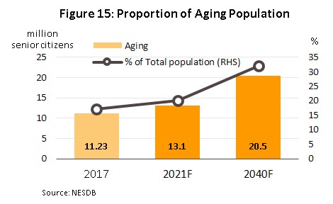 - The transition to an aging society will support rising demand for complex and technology-intensive medical interventions. The Office of the National Economic and Social Development Board forecasts that in Thailand, the number of individuals aged over 60 will rise from 11.2 million in 2017 to 13.1 million by 2021 (Figure 15), and typically 60% of the elderly have health problems[15], while the Ministry of Public Health estimates that spending on healthcare for the elderly is expected to rise from THB 63 bn in 2010 (2.1% of GDP) to THB 228 bn in 2022 (2.8% of GDP) (source: the 12th National Health Development Plan, 2017-2021)