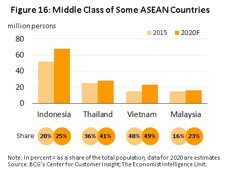 - Growth in the number of middle-class consumers with higher spending power[16] will also help to increase demand for the services offered by private hospitals. It is forecast that the proportion of the Thai population classified as middle-class will rise to 41% by 2020, up from 36% in 2015. This societal shift is also being seen in other countries in the ASEAN zone (Figure 16) and taken together this represents a significant opportunity for Thai private sector healthcare providers.