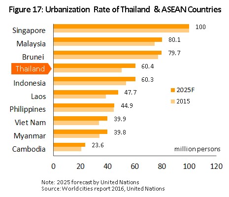 - Urbanization is continuing in Thailand and the United Nations forecasts that the Thai urbanization rate will in fact rise from 50.4% in 2015 to 60.4% in 2025 (Figure 17). This, combined with government policy to invest in national infrastructure and to establish special economic zones and the Eastern Economic Corridor, will increase opportunities for players to expand the provision of medical services and to meet demand from patients in the provinces, including non-Thais who have come to work in the country.