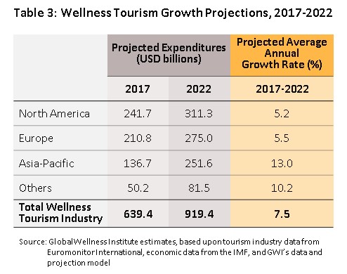 - The move to establish Thailand as an international medical hub is in line with the growing global market for health and wellness tourism. “The Global Wellness Tourism Economy Report 2013-2015” states that worldwide, health and wellness tourism was worth USD 639 bn in 2017 and that the sector is expected to grow at an annual rate of 7% through to 2022. The Asia-Pacific market is valued at USD 136.7 bn, with over 2.5 million health tourists recorded in the region annually, while in terms of its market share, Thailand is in fourth place in Asia. Services in demand from health and wellness tourists include dental care, health checks, cosmetic surgery and anti-aging treatments, though increasing interest in and concern with personal health is pushing private hospitals to spread their activities into a wider range of services. Thus, the Bangkok Hospital Group has opened the BDMS Wellness Clinic, Medical City has been opened by the Thonburi Healthcare Group and Bangpakok, Kluaynamthai and Yanhee hospitals have all established care facilities for the elderly. The Tourism Authority of Thailand (TAT) and private sector collaborate to promote Thailand to become a ‘fertility center’ to help place Thailand on the map as a hub for fertility wellness tourism, and the support of policy aimed at strengthening health tourism will help to maintain the growth of the market over the longer term (Table 3).
