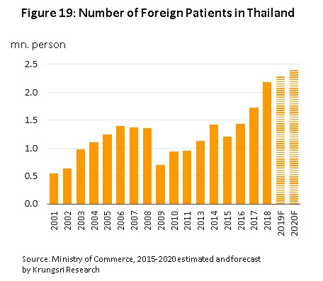 - Moves to expand the customer base will also involve looking more closely at foreign markets, and particularly at more promising segments, such as the markets in the CLMV nations, China, Russia and Africa, a move that will also reduce the pressure of relying excessively on any one market. From the point of view of hospital operators, these countries have the advantage of lacking sufficient domestic healthcare infrastructure to meet demand and so represent an open opportunity for expansion. This is particularly the case with the Chinese market, where couples are keen to use artificial insemination to have a second child, and hospitals that have expertise in this area (such as Ekachai and Piyavate hospitals) have been able to open centers for the treatment of fertility problems and so meet demand from China. It is expected that many other hospitals will rush to adjust their operations in order to do likewise. As a consequence of these moves, the number of foreign patients coming to Thailand for treatment will tend to rise (Figure 19), while trends in the coming period also point toward an increase in the number of operations abroad that are managed by Thai private hospitals. This may take the form of players building their own hospitals, investing in local operations, or establishing offices for agents to send patients on to Thai hospitals. Recent examples include the Welly Hospital in China, which was opened at the end of 2017 and which is a joint venture between Thonburi 2 Hospital and a local Chinese business, and the Ar Yu International Hospital in Myanmar (opened in 2018).Players in the private hospital sector will also face more intense competition both domestically and internationally.