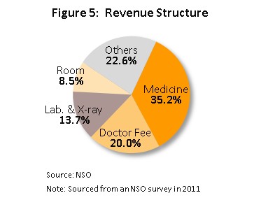 The income structure of private hospitals is such that the largest source of income (35.2%) comes from the sale of medicines and pharmaceuticals. Second in importance is medical treatments/services (20.0%), followed by laboratory tests and x-rays (13.7%), accommodation fees (8.5%), and other income (22.6%) (Figure 5).
