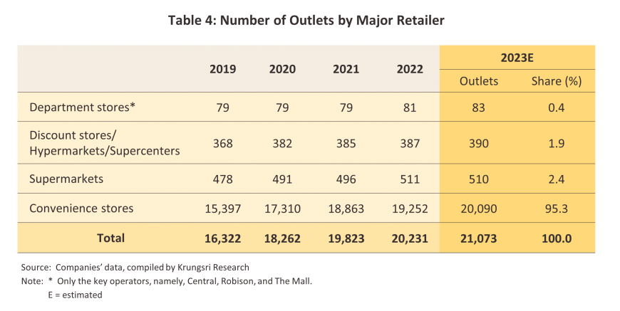 Operators have been steadily expanding their branch networks across different types of sites, including in community malls, service stations, and in areas that serve a large number of residential communities or that experience heavy traffic. Players have also been adjusting their branch sizes to make these more suitable for individual locations or particular consumer groups, and so as of 2023, there were 20,000 modern trade outlets open in Thailand, though more than 90% of these were convenience stores (Figure 3). Most operators continue to attract customers through price cuts, with many also pursuing O2O 6/ (online to offline) strategies that use branch outlets as distribution centers supporting deliveries to consumers in the immediate area, and because this gets goods rapidly into the hands of buyers, it can help to stimulate sales further.