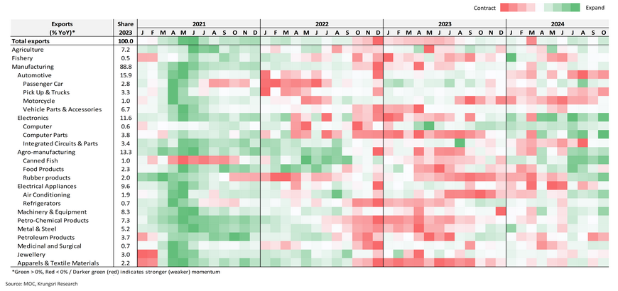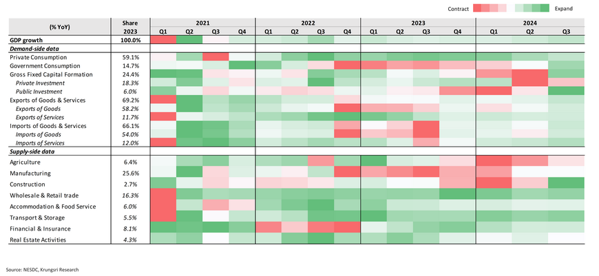 We estimate the Thai economy would expand by 2.7% in 2024, improving from 1.9% in 2023. This would be driven by a stronger recovery in the tourism sector and continued domestic spending, further supported by year-end stimulus measures targeting vulnerable groups. Additionally, export growth is expected to turn positive, aided by the cyclical recovery in the electronics sector. However, private investment is projected to contract due domestic political uncertainty, delays in public investment, and structural problems in the manufacturing sector.
