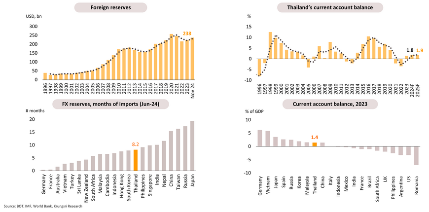 Exports are expected to grow at a moderate pace of 2.7% in 2025, supported by (i) a gradual global economic recovery, (ii) increasing demand in the electronics sector driven by the expanding digital economy, and (iii) expansion in the tourism and services sectors, which will boost exports of related goods such as food, beverage, and agricultural products. However, exports will continue to face challenges from structural issues and trade tensions between the U.S. and China, both of which are Thailand’s key trading partners.