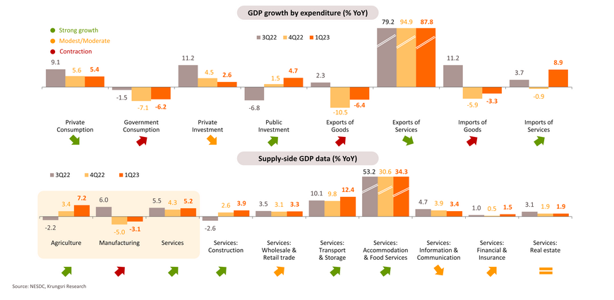 The Manufacturing Production Index fell for the 6th straight month in March, by 4.6% YoY. Despite being hurt by weak exports, there are tailwinds from recovering tourism activity and expanding domestic demand; these helped to bolster some industries such as food & beverage, petroleum and automotive. Overall capacity utilization remained below pre-pandemic level but there are some industries which capacity utilization has returned to pre-COVID level. Looking ahead, Krungsri Research expects general election activities and recovering tourism activity to support manufacturing in some industries.