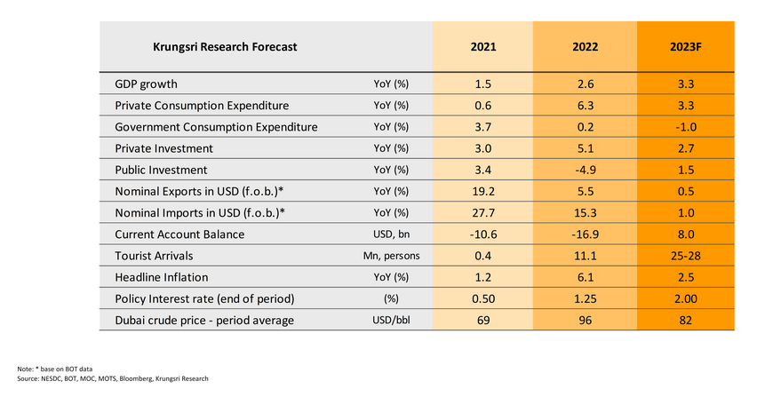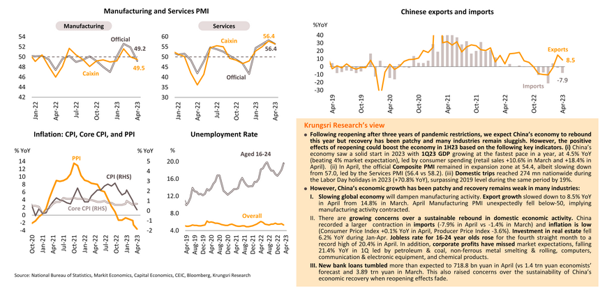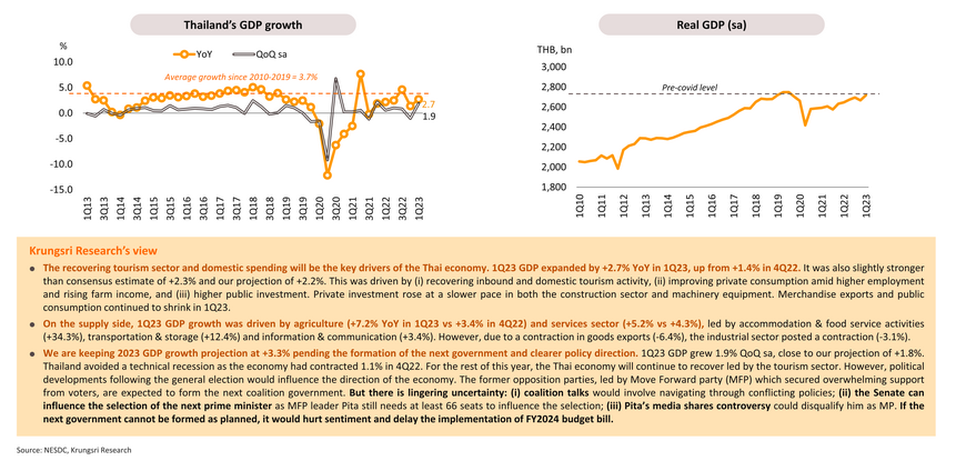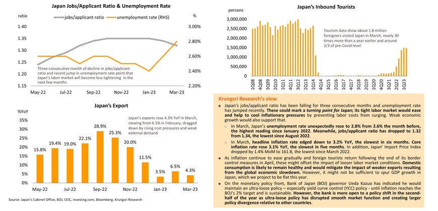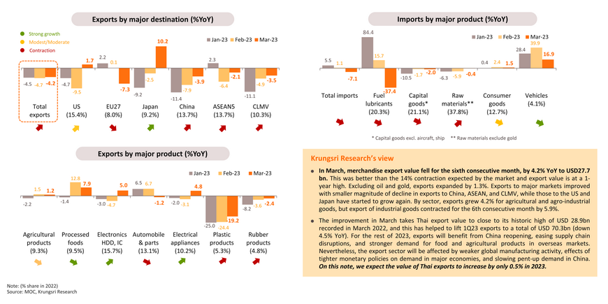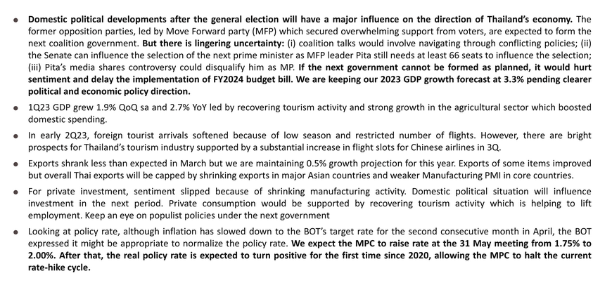 Private Investment Index turned to contract 1.5% YoY and 0.9% MoM in March. Weaker business sentiment in the manufacturing sector pushed down business sentiment index to 50.1 in April from 52.9 in March, amid concerns exports would be hurt by slowdown in trading partners’ economies. Nonetheless, there are lingering tailwinds, as evidenced by the Ministry of Commerce’s report which revealed Thailand had approved 174 investment projects by overseas investors in 1Q23 (+19% YoY) with a combined value of THB 33,048mn (+25%), mainly from Japan, China and Singapore. The BOI announced that Changan Auto, China’s 4th biggest auto manufacturer, plans to establish an EV production facility in Thailand with an investment of THB 9,800mn. Looking ahead, the political situation and economic policy direction could have significant impact on business confidence and investment in the next period.