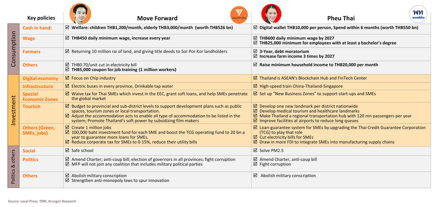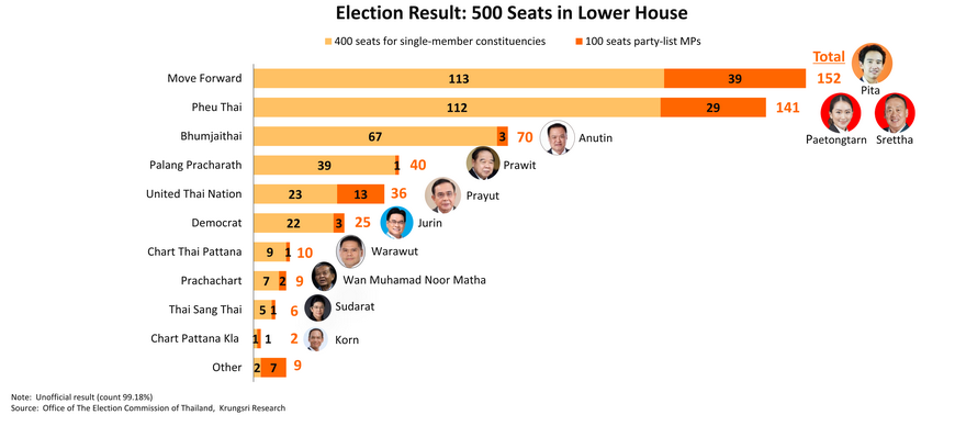 We summarize two scenarios for the next coalition government. With 99% of votes counted by May 15, Move Forward Party (MFP) and Pheu Thai Party (PTP) are the unofficial winners with 293 seats in the 500-seat Lower House; while Palang Pracharath Party (PPRP) and United Thai Nation Party (UNTP), the former government parties, won about 76 seats in total. However, there is lingering uncertainty over whether the pro-democratic parties would be able to form the next government because parliamentary rules require the 250 members of a military-appointed Senate to vote on the Prime Minister appointment.