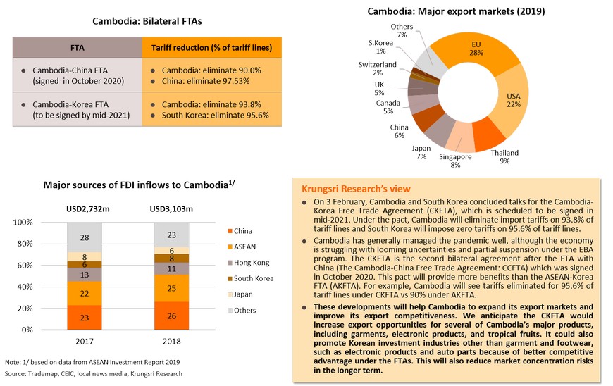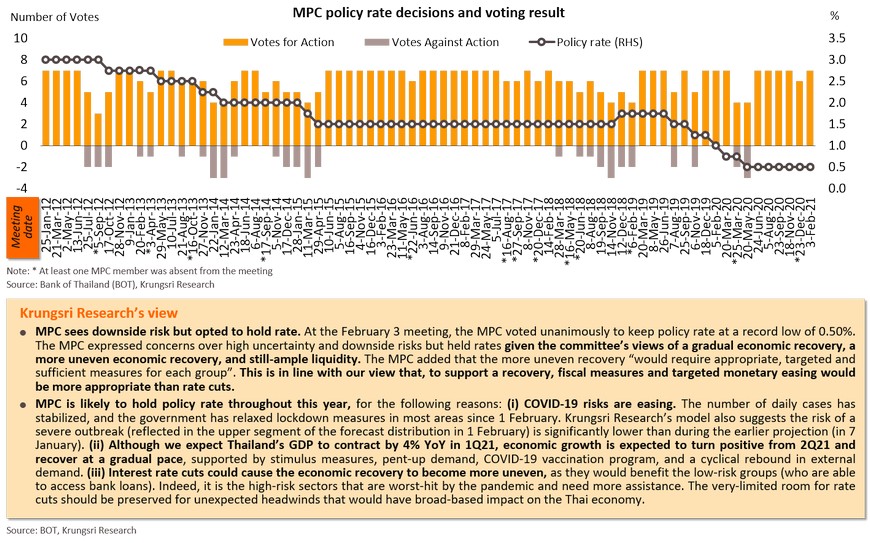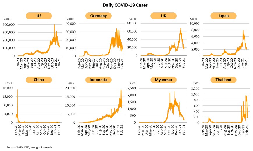 The huge monetary and fiscal measures introduced since the pandemic seem sufficient to ease the impact and support the overall economy. In January, the Bank of Japan (BOJ) upgraded its economic growth forecasts for 2021 from +3.6% to +3.9%, citing positive momentum and the unprecedented stimulus packages. The BOJ continues to keep a very-loose monetary policy by controlling the yield curve, employing unlimited asset purchases, and offering interest-free lending facilities. In January, bank loan growth exceeded 6% for the 8th straight month, led by lending to SMEs. Also, the BOJ would likely keep negative interest rate until 2023. Meanwhile, the government has launched a series of supplementary budgets to ease the pandemic impact and boost domestic spending. Recently, the government decided to disburse JPY1.2trn from FY2020 reserve funds to increase subsidies for hard-hit restaurant operators and their suppliers. In addition, Japan will start its vaccination program at end-February. The government now plans to inoculate half its population by end-July (instead of June). Therefore, the current monetary and fiscal stimulus, and the vaccination program, should help keep the economic recovery on track.