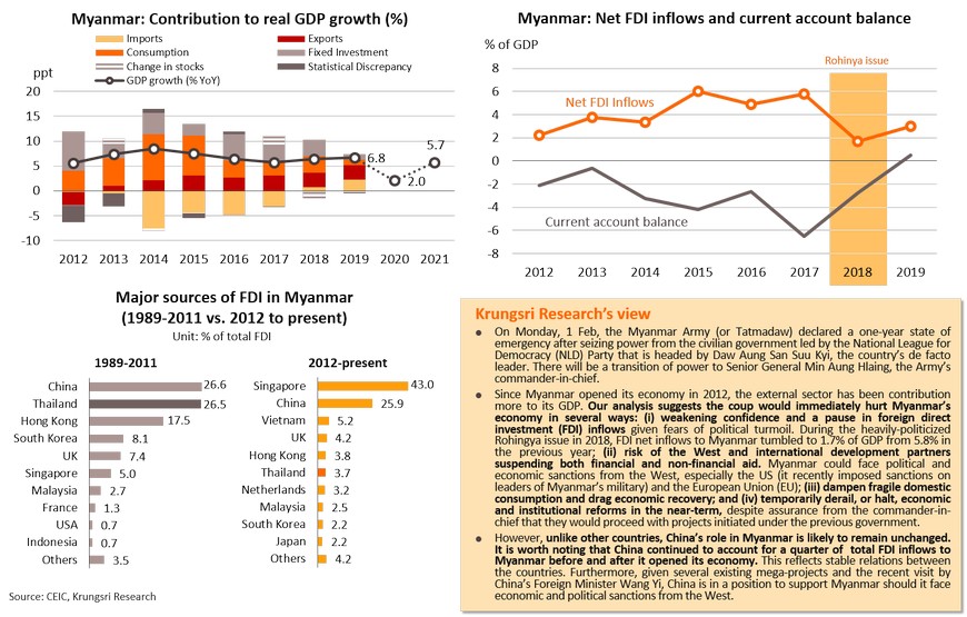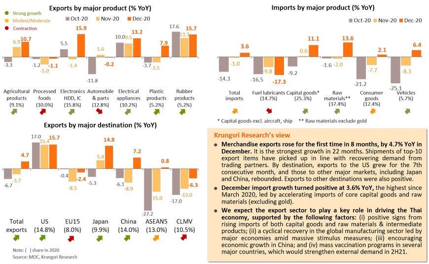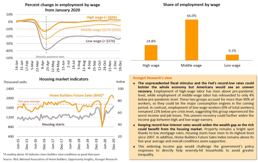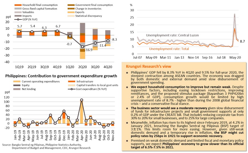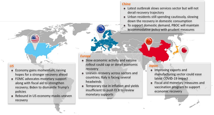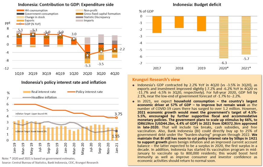 The US economy expanded 4% QoQ saar in 4Q20, but contracted by 3.5% for full-year 2020. The expansion in the final quarter was led by investment in both residential (+33.5%) and non-residential sectors (+13.8%). Private consumption, the biggest contributor to the economy, booked a moderate rebound at +2.5%. 4Q20 real GDP remained 2.5% below pre-pandemic level. However, the vaccine rollout and optimism towards large fiscal stimulus induced a more upbeat outlook, prompting the IMF to revise up 2021 US GDP growth forecast to 5.1% from 3.1% in the previous forecast. Services sector signaled a gradual improvement despite the resurgence of COVID-19, led by employment (55.2 in January vs 48.7 in December). Manufacturing PMI remained solid. Non-farm payrolls turned to increase by 49k jobs and unemployment rate dropped to 6.3%, reflecting the return to work and resumption of economic activities. The positive momentum would raise hopes for a stronger recovery ahead.