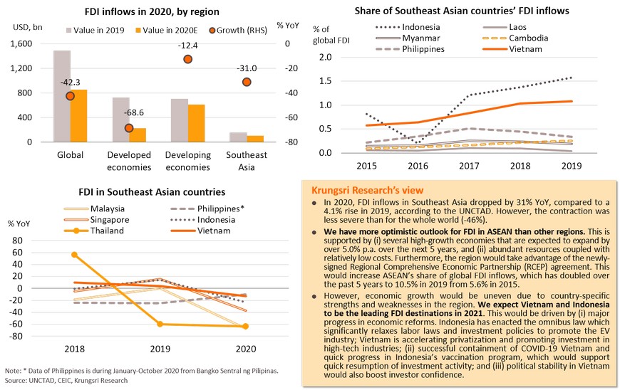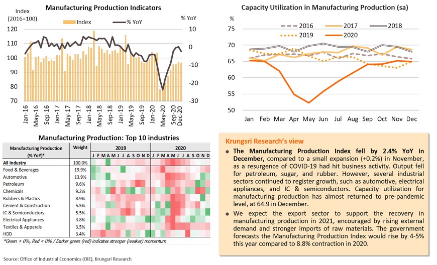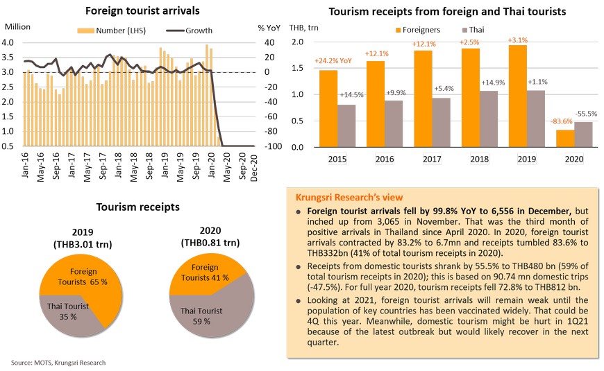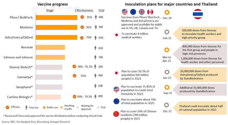 Vaccines from Pfizer, Moderna and AstraZeneca have been approved for public use, but the rest are mostly still in late-stage trials. Some countries have started vaccination programs in December last year. The US and the EU would probably be able to inoculate more than 70% of their population this year. China also plans to vaccinate about half of its citizens in 2021. In Thailand, about 50% of the population could receive a vaccine this year. However, deliveries and efficacy remain doubtful. The global and domestic vaccine uncertainties means international border restrictions could remain in place for most of this year. This means Thai economy would have traverse another bumpy road to recovery this year. Additionally, that might send global and Thai economies into the unwanted scenario of an “extended COVID-19 pandemic”.