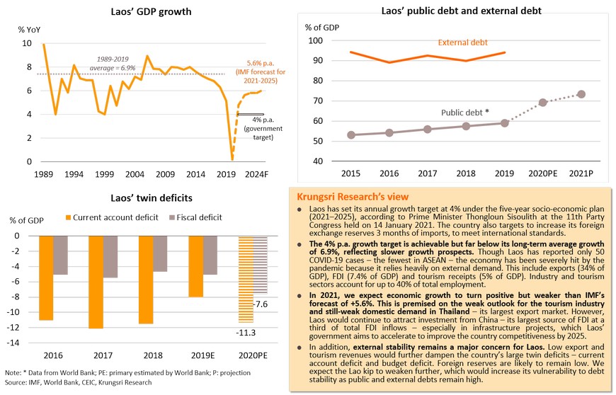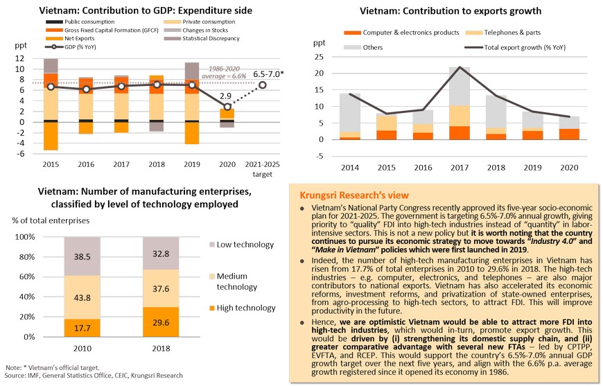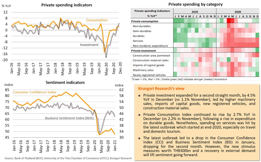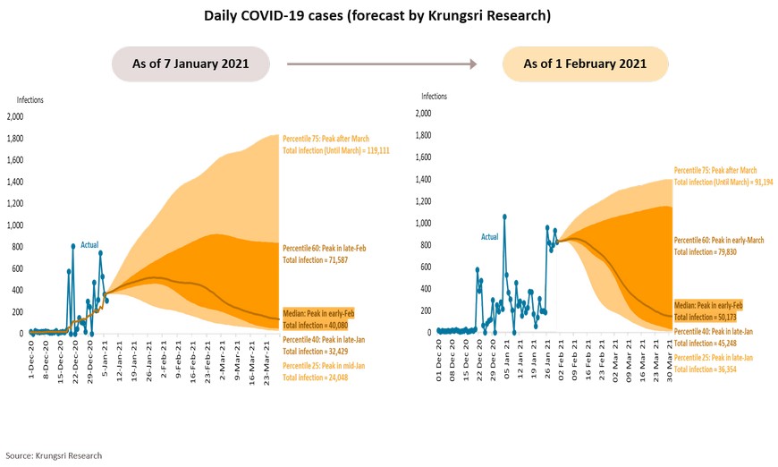 China’s economy will continue to recover through 2021 as economic activities have been improving since last year and the latest outbreak is expected to have only temporary impact. In December 2020, industrial capacity utilization and value-add in the industrial sector reached 3-year highs. In January, both Manufacturing and Non-Manufacturing PMI data remained in expansion mode for the ninth consecutive month. Manufacturing sub-indices for new export orders and new orders also stayed above-50, indicating production will continue to expand in the coming period. Although travel restrictions and partial lockdown could affect the services sector in the beginning of this year, these might support manufacturing because companies might continue to operate instead of normally shutting down for 1-2 weeks during the Lunar New Year break. Online logistic businesses would also continue to operate during the seasonal holidays. These activities could mitigate the impact from the latest outbreak. Daily COVID-19 cases have dropped significantly and there have been no local transmission for the first time in two months. The government has also eased restrictions. These would support economic activities in the next period.