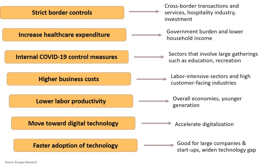 Hospitality industries, including hotel, restaurant, recreation, and transportation, would remain the hard-hit sectors as cross-border travel would continue t be restricted. Oil & gas and refinery sectors would be hit by lower demand for transportation. The education (face-to-face) sector would also weaken. At the other end of the spectrum, hospitals would benefit from higher expenditure on healthcare. Meanwhile, telecommunication, electronics and banking sectors could accelerate digitalization and adoption of technology. If COVID-19 becomes a seasonal epidemic, that could lead to relocation of resources and labor from hard-hit sectors to fast-growing sectors. That would make is easier to identify winners and losers.
