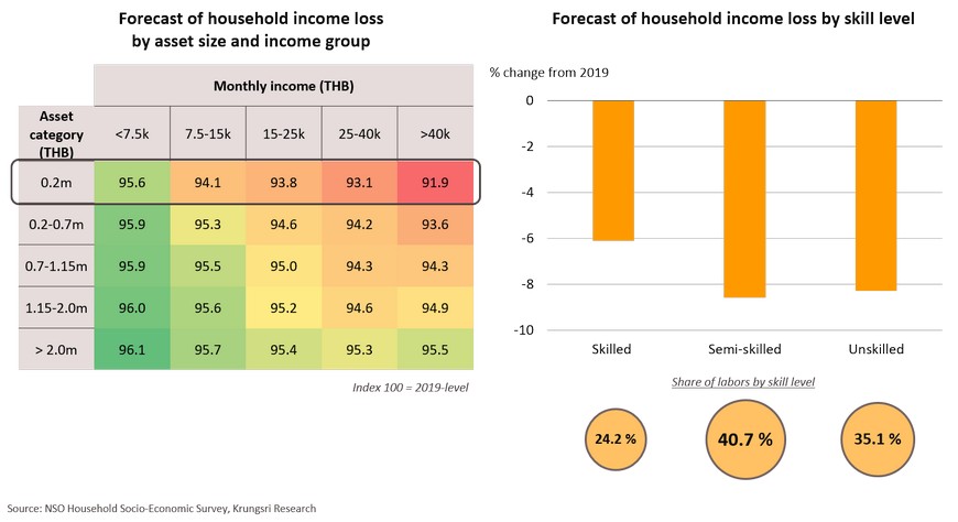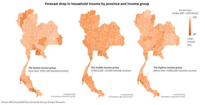 The high-income group will be resilient to further shocks and their income will return to near pre-crisis level. Overall, the middle- and low-income groups in major provinces would remain the hardest-hit. An extended pandemic could force the low-income group to relocate to rural areas, which would worsen income inequality in Thailand. That could slow down economic recovery in the coming years.