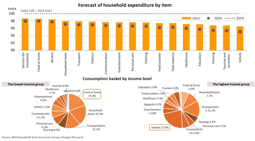 The impact on the labor market is transmitted through lower household income and spending. Average income in 2021 is estimated to drop by 7% from pre-crisis level in 2019, but the income losses will be uneven among the different income group. The high-income group would be least affected (-6.6%). Average income for the working class would drop by 7.6%. And, the low-income group could see the largest drop in income, especially in major provinces such as Chonburi (-12.7%), Bangkok (-12.3%), Phuket (-12.2%), Chiang Mai (-9.8%) and Krabi (-9.4%). The pandemic has highlighted the level of income-inequality in Thailand which would lead to uneven recovery among the high- and low-income groups.