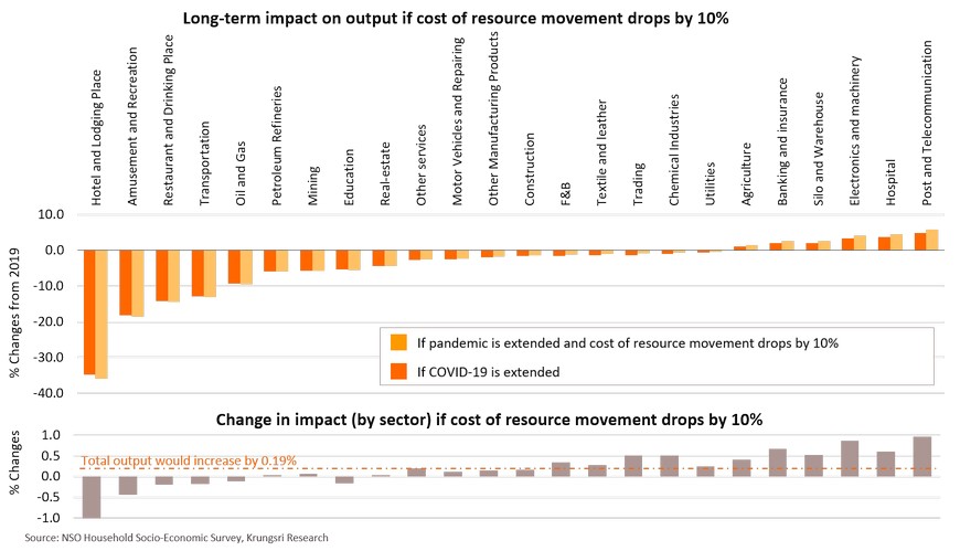 Several industries will perform better if resources are allowed to move freely across sectors. Although hotel & lodging places, recreation, and restaurant industries will continue to underperform, total industry output would increase by 0.19% if cost of resource movement drops by 10%. This would boost average wage by 0.24% and support economic recovery in coming years.
