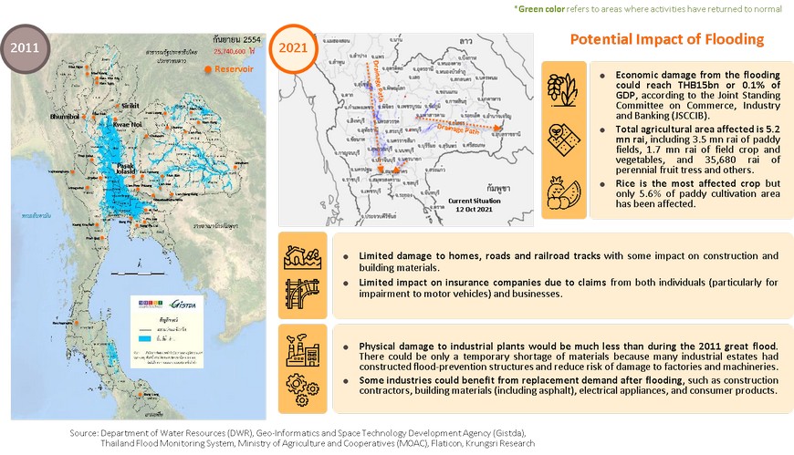 There is higher risk of flooding if (i) storms are stronger than expected in Thailand; (ii) heavy rains fall continuously below the major dams; and (iii) water level in the Chao Phraya River increases with a surge in sea level. The key indicator is water outflows from the Chao Phraya dam, which was 2,520 cubic meters per second (as of 12 October 2021). The critical level is 3,500-4,500 cubic meters per second, which was seen during the 2011 great flood.