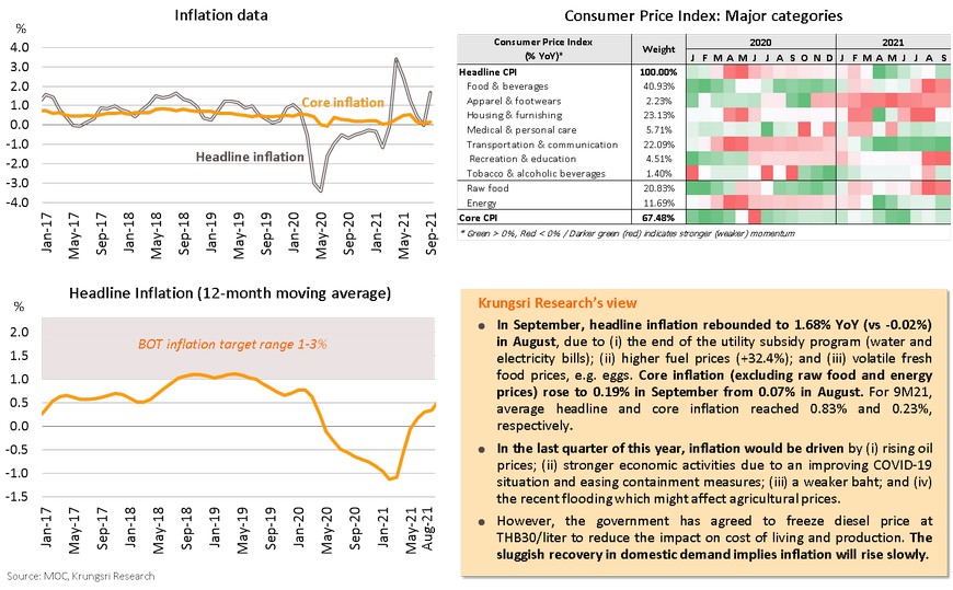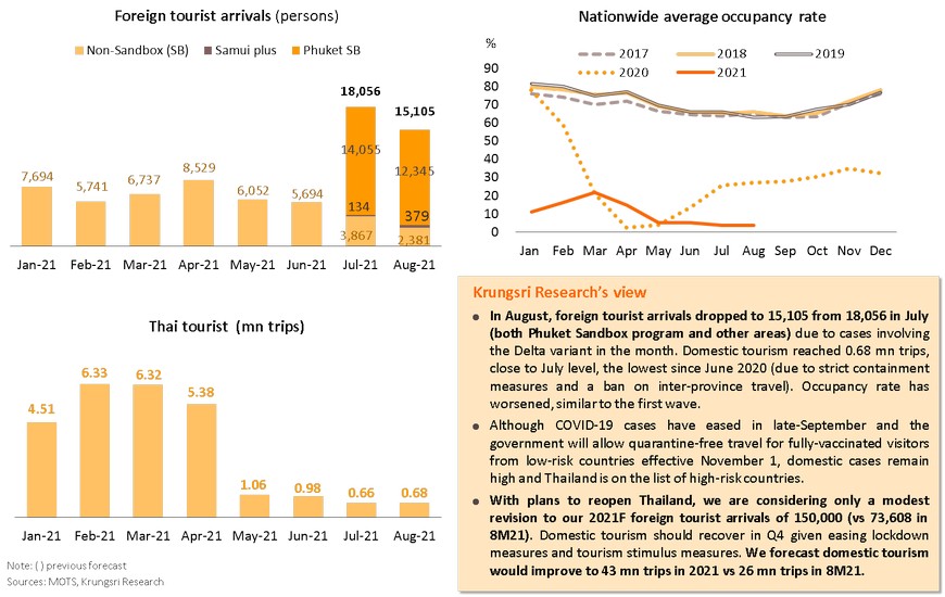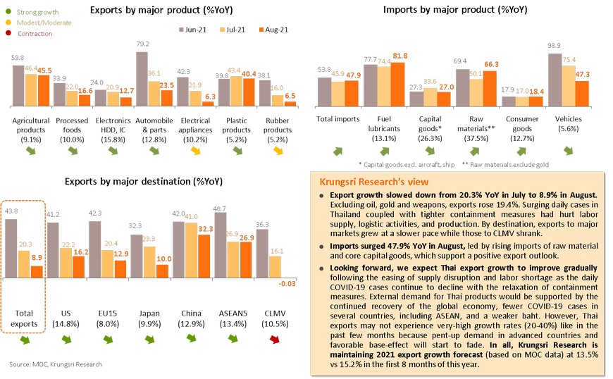 Even though Thailand’s export value fell to USD22.0bn in August from USD22.7bn in July, it remained well above the last 5-years’ August average of USD21.0bn. And, the main export growth driver this year is higher export volume rather than price hikes, suggesting a positive outlook for Thai products. Looking ahead, Thai exports should rebound, premised on positive trends in Manufacturing PMI data for key ASEAN countries, particularly Malaysia, Indonesia, and the Philippines, as the COVID-19 impact on their supply chains fades. The World Trade Organization (WTO) also recently revised up its growth forecast for world trade volume for 2021 to 10.8% (from 8.0% previous forecast) and for 2022 to 4.7% (from 4.0%), which would support economic growth of export-dependent nations, including Thailand.