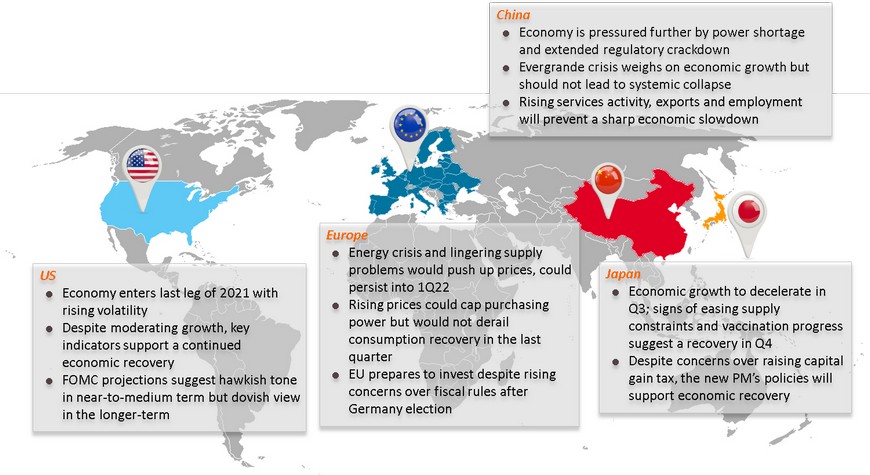 Concerns over temporary lifting of debt limit, rising energy prices, an overheating housing market, and the beginning of policy normalization, would increase volatility and risks in financial markets in the final quarter of 2021. These could threaten economic growth and fuel fear of rising cost of living. The House approved to raise debt limit to USD28.9trn, pushing off risk of default at least until early-December. However, historical data show that although the debt ceiling is lifted or suspended, markets remain volatile for about a least a month before easing. US natural gas price has jumped 140% this year while oil price has risen to its highest since 2014, partly due to escalating demand since reopening. Surging natural gas and oil prices have increased inflationary pressures and inflation rate could exceed policymakers’ expectations and push up production costs. The overheating housing market is fueled by rising home prices and solid demand. Demand continues to exceed supply because of low mortgage rates and fewer people working at the office. However, record-high prices have eroded consumers’ affordability. Moreover, increasing overnight interest rates of major central banks suggest the start of policy normalization later this year. This would affect bond yields, currency movements and capital flows. Looking ahead, volatility could dampen economic growth in 4Q21 and early-2022.