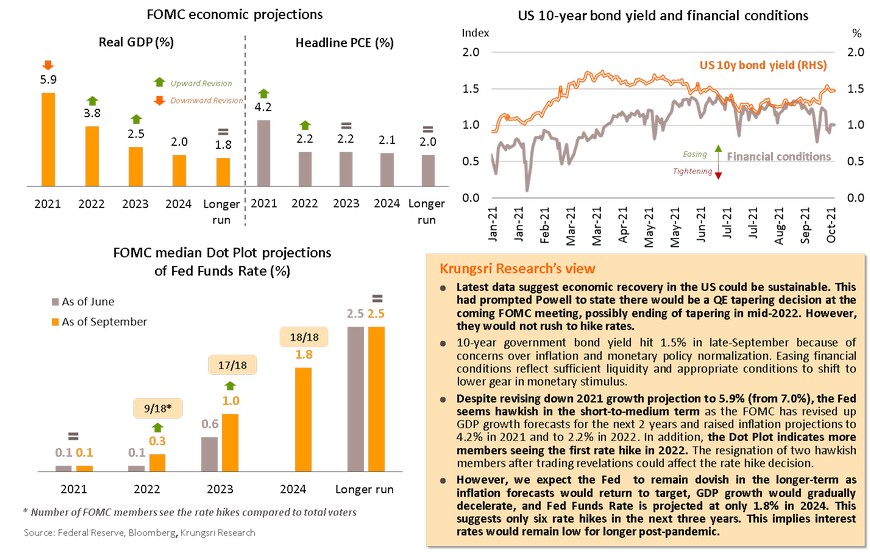 Despite visible delivery problems and weaker-than-expected job data, the economy continued to expand in September, suggesting the delta-variant only had a temporary impact on demand. Services sector PMI inched-up to 61.9 and Manufacturing PMI to 61.1 despite supply bottlenecks. The mild rise in non-farm payrolls reflect hiring problem. However, unemployment rate is at its lowest since Feb 2020, at 4.8%. The expiry of unemployment benefits and school reopening should improve hiring in the coming months. Moreover, average wage has risen more-than-expected at 0.6% MoM, suggesting consumption will continue to pick up. Hence, despite higher prices, rising wages and a rebound in online & grocery shopping activities could boost retail sales in 4Q21. Retailers are stocking-up for the holiday season, including retailers of home decoration and food supplies. Other businesses also signaled improvements and preparation for new investment. Orders for cars, appliances and computers had risen in August; improving durable goods new orders would support GDP growth in 2H21 and could lift manufacturing capacity. These would support a continued economic recovery in the next period.