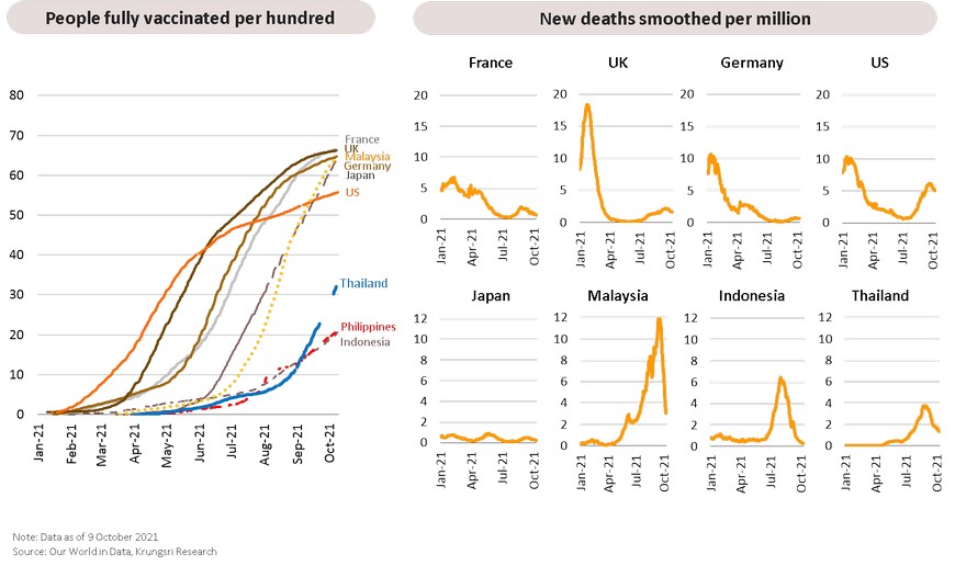 Vaccination rate in Thailand has reached 49% (including 1- and 2-dose), which is among the key reasons that daily cases in Thailand have been dropping. Currently, 21.2 million or 30% are fully-vaccinated and 14.2 million have received one dose. Thailand has dispensed 60 million doses of COVID-19 vaccines. However, the pace of vaccination has slowed down worldwide, including in Thailand, and it would require a strong push to achieve above-80% vaccination rate. Krungsri Research expects Thailand to continue to dispense nearly 0.5 million vaccines a day up to end-2021, which means 90.3 million doses dispensed by end-2021. This implies 37.3 million persons are expected to have fully-vaccinated [51.3% of Thai population] and a total of 54.0 million would receive at least one dose [74.3%] by year-end. Based on latest dynamics, at least 85% of the population would receive at least one dose by the second quarter of 2022. Currently, mass vaccination programs are concentrated in large provinces including BMR (100% of Bangkok residents have been vaccinated), Phuket (79%), and Chonburi (69%). Meanwhile, 35 provinces have a vaccination rate of less than 35% of their population. That leaves many provinces vulnerable to COVID-19 risks, especially Tak, Sakaew, and provinces in the South.