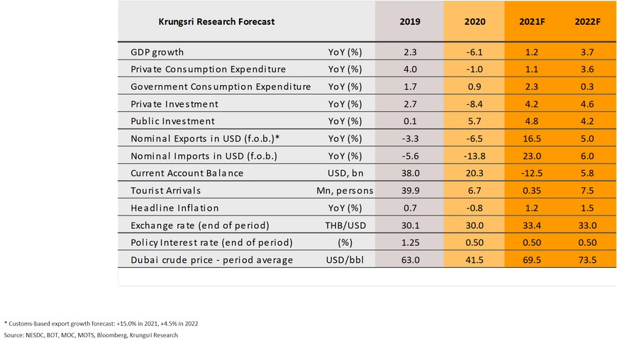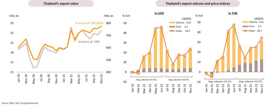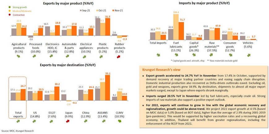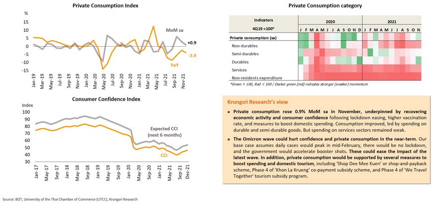 Private Investment Index (PII) expanded by 1.3% MoM sa in November driven by stronger external demand and recovering business sentiment recovery. Thai Manufacturing Production Index (MPI) and Capacity Utilization rebounded in November. Production capacity utilization has yet to reach pre-pandemic level but utilization rates in several key industries have exceeded pre-pandemic levels, especially automobile, pharmaceuticals, IC & semiconductors, electrical appliances and furniture. Production in some industries are approaching their pre-pandemic levels, including HDD, medicals, machinery and rubber & plastics. The impressive outlook for exports could encourage business investment this year.
