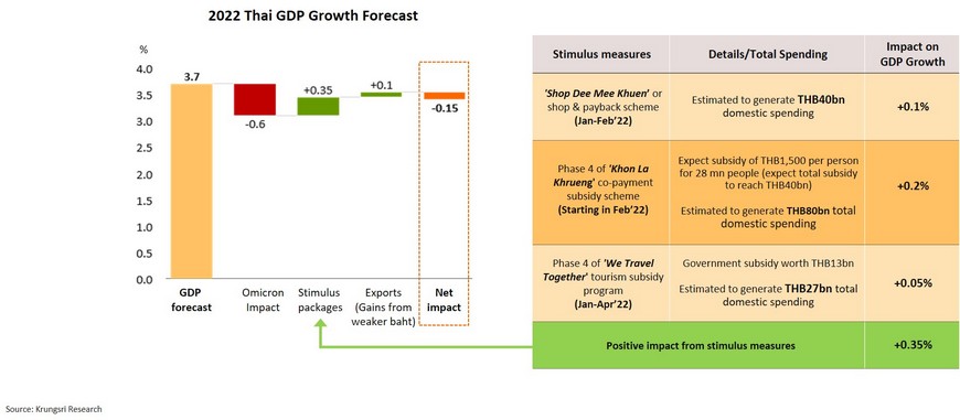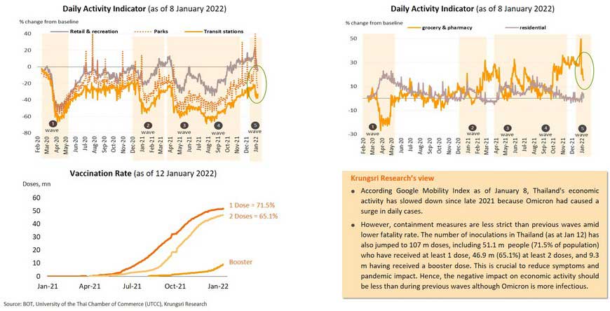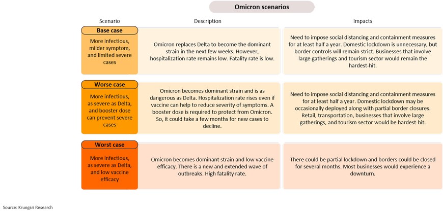 Concerns over Omicron outbreaks would slow the relaxation of COVID-19 containment measures, especially border controls. Stricter containment measures would limit domestic economic activities and delay economic recovery in Thailand. Our model suggests the stringency index would be higher than before Omicron. Domestic activities under each scenario would be reduced by 0.9%, 2.0% and 3.2% from our initial forecasts, respectively. Containment measures on domestic activity should be less stringent than last year but border control would remain strict. Tourism activities would drop by 7.1%, 21.7% and 36.8%, respectively. This suggests Omicron outbreak would hurt tourism-related sectors the most, rather than overall domestic economic activities. Overall economic activities under each scenario would drop by 0.6%, 1.4% and 3.0%, respectively. This would delay recovery in Thailand - to pre-COVID level - by a quarter, from Q422 to Q123.